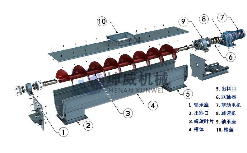 螺旋輸送機(jī)主要部件包括驅(qū)動(dòng)裝置,機(jī)頭,機(jī)尾,內(nèi)管軸。